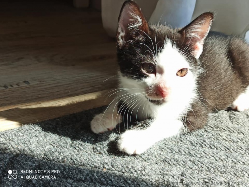 Mit meinen Brüdern Freddy und Joshi zog ich mit 5 Wochen auf Pflegestellen. Anfangs ging es uns nicht gut. Hatten Schnupfen und entzündete Augen. Mir ging es so schlecht das ich alle paar Stunden mit der Hand gefüttert werden musste. Inzwischen kann ich das natürlich schon allein aber trotzdem bin ich im Vergleich zu meinen Brüdern doch sehr zierlich.