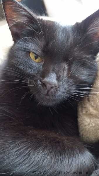 Bevor ich zur Tierhilfe kam, hatte ich ganz schlimme Schmerzen, mein Auge hat mir schrecklich weh getan. Liebe Menschen haben mich an einer Streunerstelle entdeckt und gleich zur Tierärztin gebracht. Leider war mein Auge nicht zu retten, aber das macht nichts, ich komme auch mit einem Auge sehr gut zurecht.