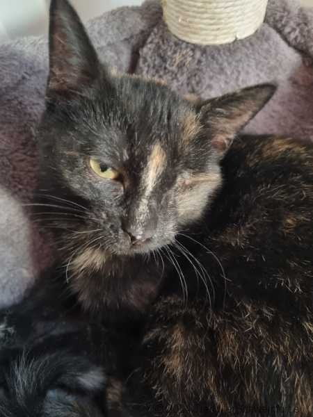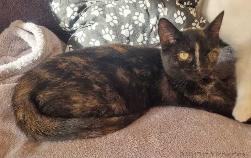Und obwohl ich am Anfang ganz viel Angst hatte, bin ich doch recht froh, nun von weichen Kuscheldecken und Streichelhänden umgeben zu sein. Das Leben da draußen als heimat- und familienloses Mädchen war sehr hart und hat mich auch gezeichnet. Ich wurde wohl mehrfach verletzt und mein linkes Auge war leider nicht mehr zu retten. Eine Wunde an der Schulter, wahrscheinlich von den vorstehenden Nägeln an den Paletten, hat meine Pflegemama gut versorgt und so ist sie recht schnell abgeheilt. Ich genieße es jetzt ganz arg, mit der Pflegemama und auch den anderen Kätzchen hier zu spielen und zu schmusen.