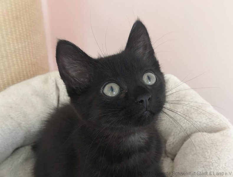 Das schwarze Mädel ist ein zuckersüßer Wirbelwind. Sie weiß nicht wirklich was Zurückhaltung bedeutet und genießt es ausgiebig mit Menschen zu schmusen. Zur Not wird auf die Pflegemama geklettert oder an ihrem Bein gerieben, damit sie bemerkt wird. Auch Hinterherlaufen und in unbemerkten Momenten zwischen die Füße watscheln steht bei den drei Geschwistern hoch im Kurs. Jeder Gang zu den Pflegekatzen gestaltet sich als Hindernisparcour.
