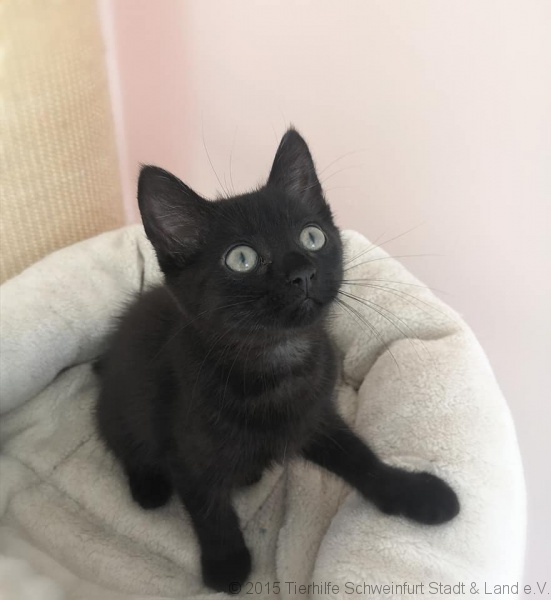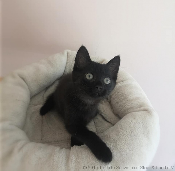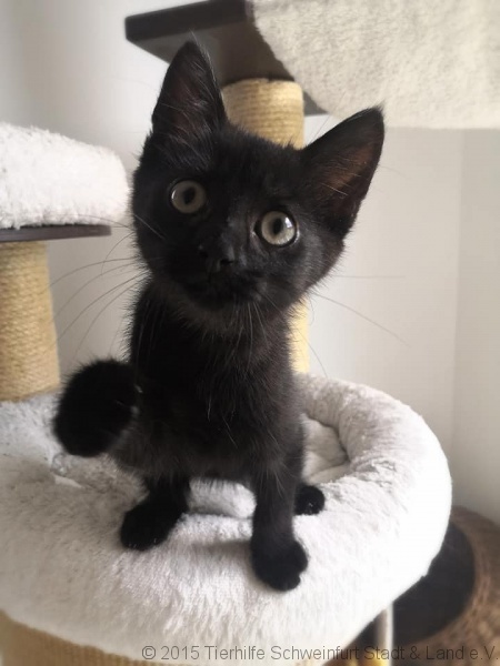 Das schwarze Mädel ist ein zuckersüßer Wirbelwind. Sie weiß nicht wirklich was Zurückhaltung bedeutet und genießt es ausgiebig mit Menschen zu schmusen. Zur Not wird auf die Pflegemama geklettert oder an ihrem Bein gerieben, damit sie bemerkt wird. Auch Hinterherlaufen und in unbemerkten Momenten zwischen die Füße watscheln steht bei den drei Geschwistern hoch im Kurs. Jeder Gang zu den Pflegekatzen gestaltet sich als Hindernisparcour.