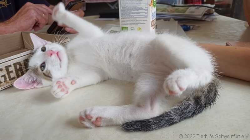 Da waren wir noch ganz klein und brauchten alle zwei Stunden ein Fläschchen. Das ging im Tierheim nicht und darum sind wir auf die Pflegestelle der Tierhilfe Schweinfurt gezogen. Da gab´s dann immer Milch und Kuscheleinheiten und man hat uns beigebracht, daß Naßfutter auch ganz lecker ist und wie man ein Katzenklo benutzt.