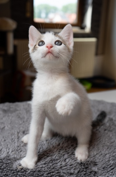 Weil ich ein sogenanntes Flaschi bin, bin ich besonders zutraulich und verschmust. Angst habe ich kaum, ich mag Kinder und Hunde. Die kenne ich schon und komme gut klar damit. Wenn ich bei Dir einziehen darf, brauche ich natürlich einen Spielkameraden, mit dem ich rennen, raufen und auch kuscheln kann. Wenn bei Dir noch keiner wohnt, dann kann ich Dir meine Geschwister empfehlen. Mit Gregory z.B. habe ich viel Spaß, den könnte ich dann mitbringen.