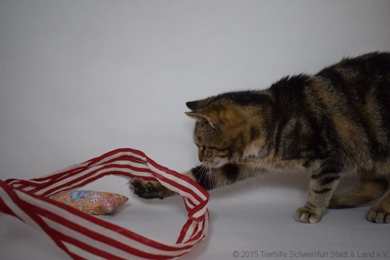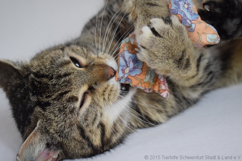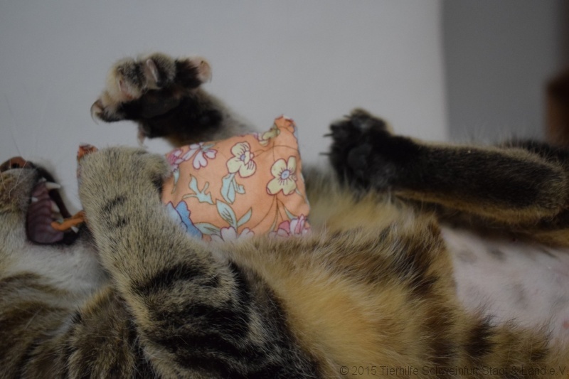 Sie wurde tierärztlich versorgt, kastriert, gechippt und geimpft. Sie fühlt sich in ihrem temporären Zuhause sehr wohl, schläft gerne auf ihrem Lieblingskissen und spielt stundenlang mit dem Kreisel, den Bällchen und den Federangeln ohne müde zu werden. Sie ist sehr verschmust und lässt sich ihr pralles Bäuchlein kraulen.  Sie lebt auf der Pflegestelle mit zwei Seniorinnen zusammen, aber geht diesen klugerweise aus dem Weg, weil die immer fauchen und knurren.