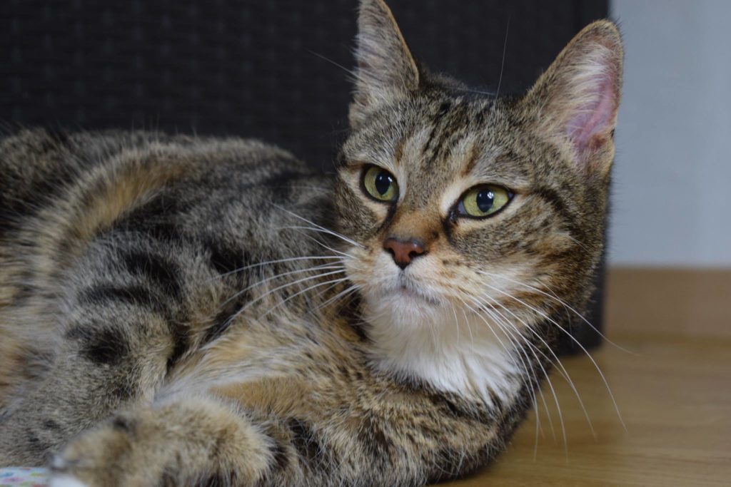 Kiki, 11 Jahre, braun-schwarz gestromt, kastriert, tätowiert, gechipt und geimpft.