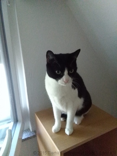 So zog er auf eine Pflegestelle der Tierhilfe. Anfangs ganz durcheinander und ängstlich wollte er erstmal niemand an sich ranlassen. Aber das legte sich innerhalb weniger Tage. Er sehnt sich richtig nach Streicheleineinheiten und kann gar nicht genug bekommen. Wenn dann die Pflegemama dazu einige Leckerlies reicht ist er im Himmel. Den beiden anderen kätzischen Mitbewohnern steht er wohl eher unfreundlich gegenüber, geht aber lieber aus dem Weg und schüttelt die neugierigen Katerbuben ab.