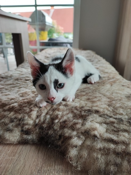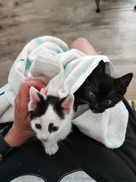 Hallo ihr Katzenfans da draußen! Wir sind Amelie (weiß mit schwarzen Flecken) und Elena (schwarz mit weißem Latz und weißen Pfötchen). Unsere Mama ist leider kurz nach unserer Geburt verschwunden. So ganz ohne Mama lässt es sich aber nur schwer überleben da draußen. Das haben sich zum Glück auch die lieben Menschen gedacht, die unser herzzerreißendes Jammern gehört und uns zur Tierhilfe gebracht haben.