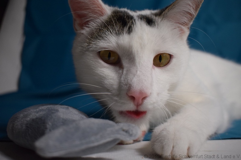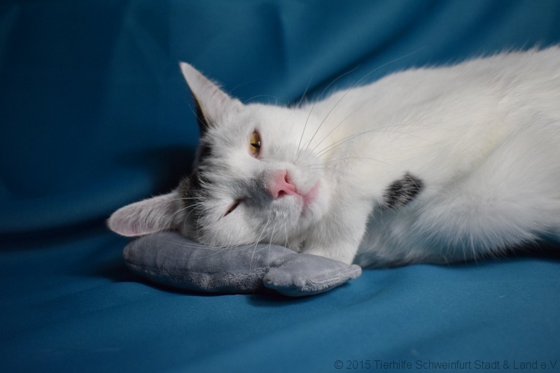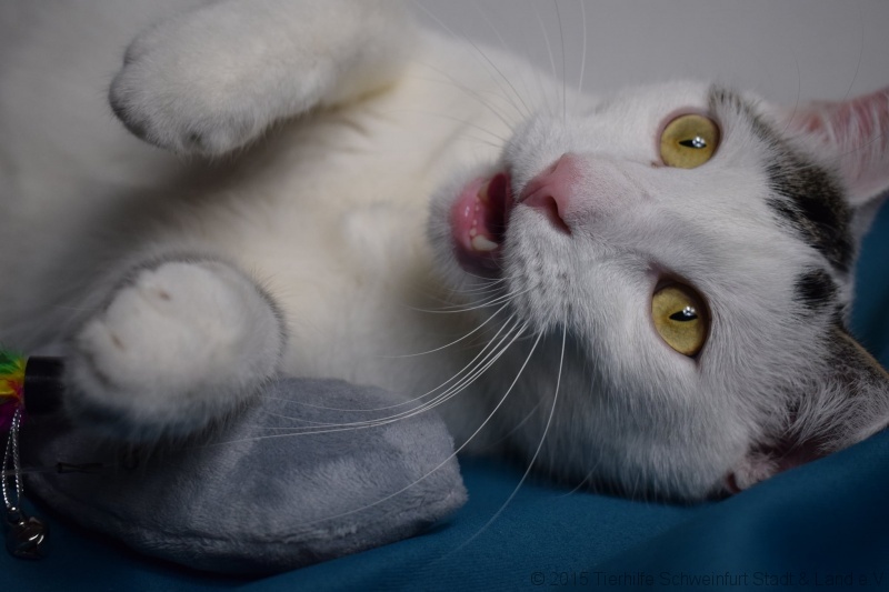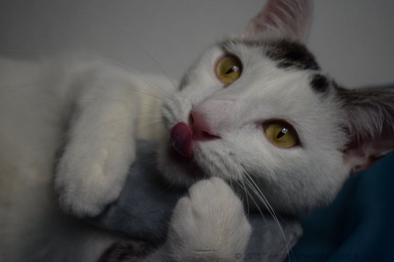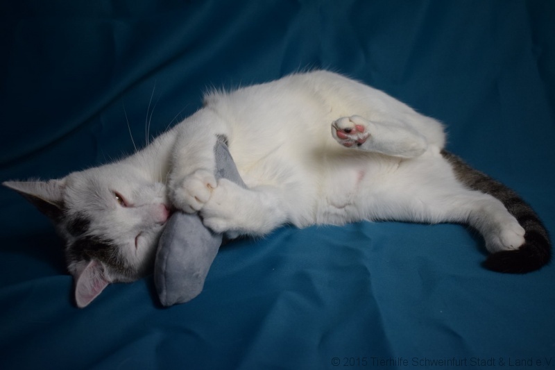 Mittlerweile ist aus dem „Kleinen“ ein stattlicher bildhübscher Jungkater geworden. Seine Pflegemutter schmilzt dahin, wenn er sie mit seinen Glupsaugen anschaut und ihr von seinem Tag erzählt. Geschlafen wird unter der Bettdecke mit oder auch ohne Pflegemama. Ist sie mit ihrem Handy beschäftigt muss er wissen was sie macht, dauert es ihm zu lange übernimmt er und wirft sich zum Bauch kraueln über das Handy auf den Rücken. Spielzeug braucht er nicht viel. Einige Bällchen, die er selbst wirft und wieder fängt um sie stolz als Beute rumzuschleppen, sind sein liebstes Spielzeug. Am besten findet er Fliegen „catchen“. Da ein Fenster zum Freisitz immer offen ist, verirrt sich der eine oder andere dicke Brummer in die Wohnung. Dem wird der Garaus gemacht. Lecker 😊.
